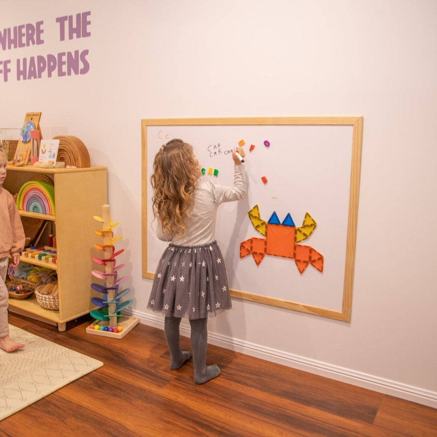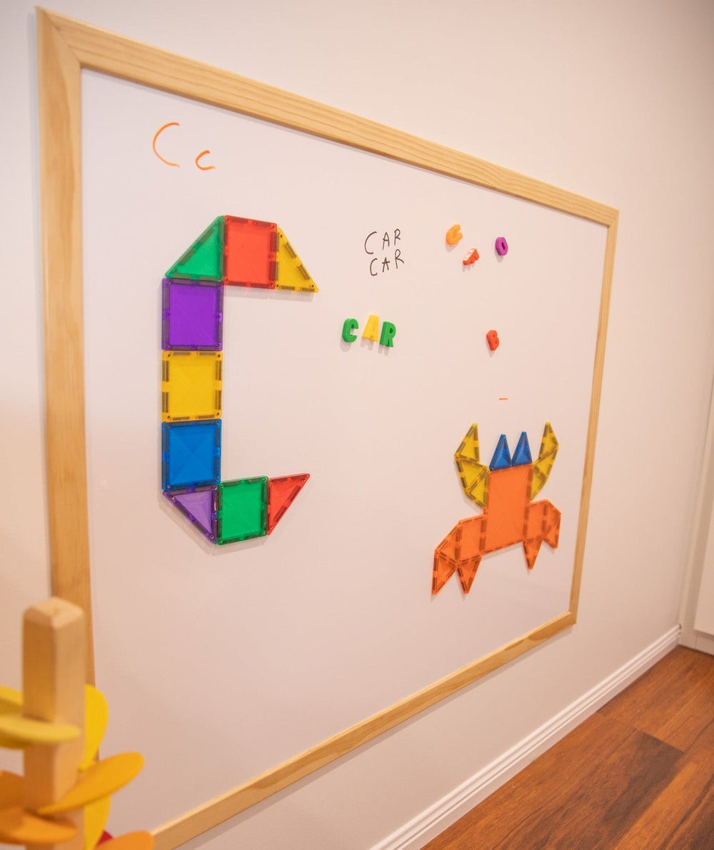 These beautiful Vertical Play Boards (aka our beautiful magnetic whiteboards) feature a pine trim for the ultimate finish. A beautiful, artistic feature to your room whilst providing space for writing or magnetic accessory use. A fun and functional feature for your room.